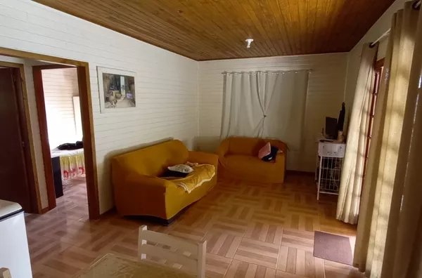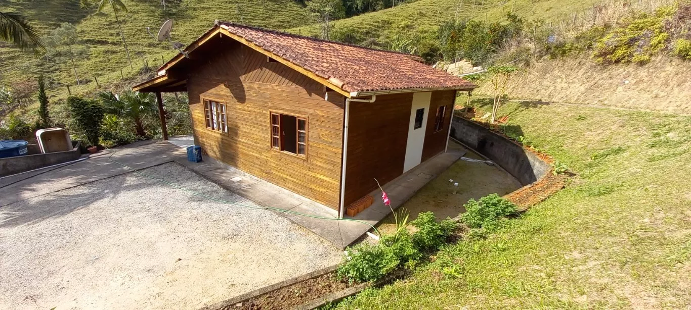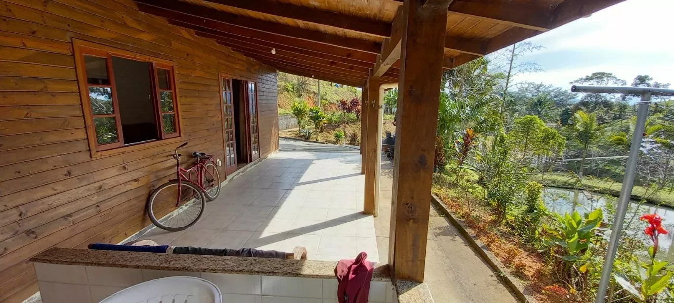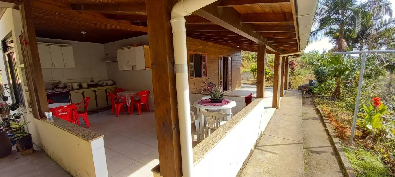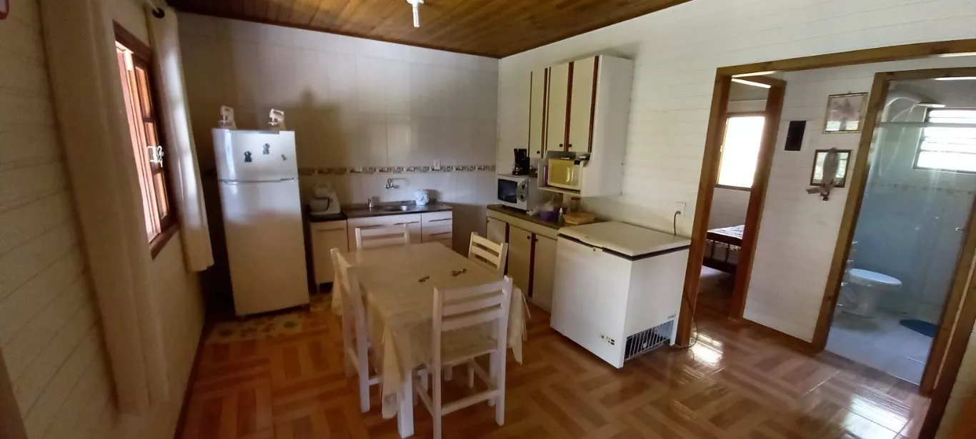 Casa de madeira tratada com 100m², possui 02 dormitórios, 01 banheiro social, sala e cozinha conjugada, garagem. MOBILIÁRIO NÃO INCLUSO. Área de lazer aberta com 60m2, churrasqueira , fogão a lenha e banheiro. Área de serviço com 25,00m², galinheiros, chiqueiro para porcos, estábulo para gado. ANIMAIS NÃO INCLUSO.