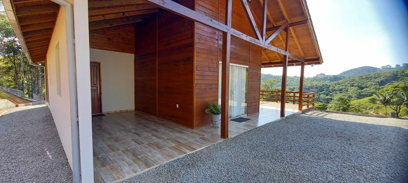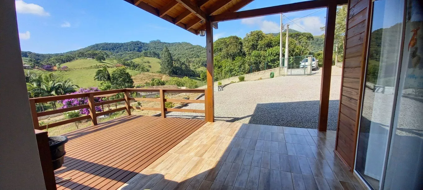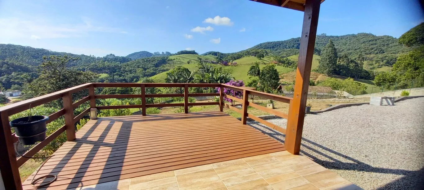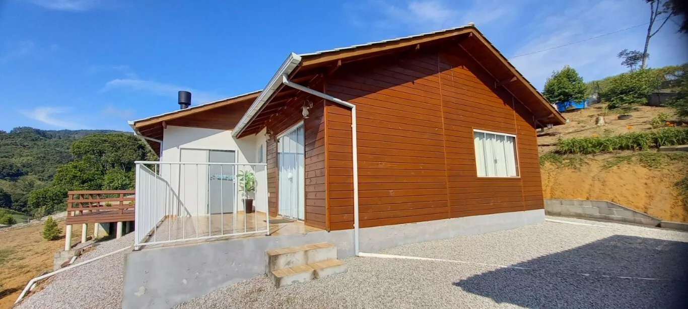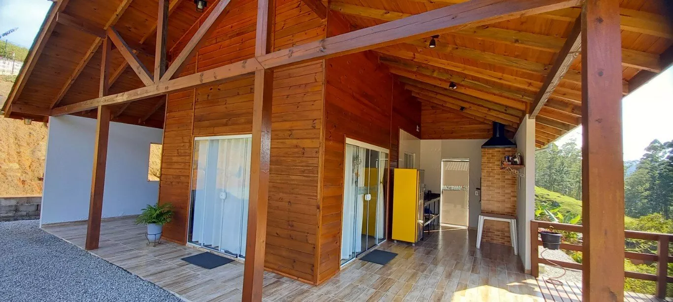 Casa de madeira mobiliada com 113,00 m2, distribuída em 01 dormitório, 01 suíte, sala e cozinha conceito aberto, 01 banheiro social, lavanderia, 01 garagem, área com gourmet churrasqueira, deck de madeira com linda vista para um vale.