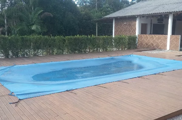 Área de piscina com deck de madeira com 90m².