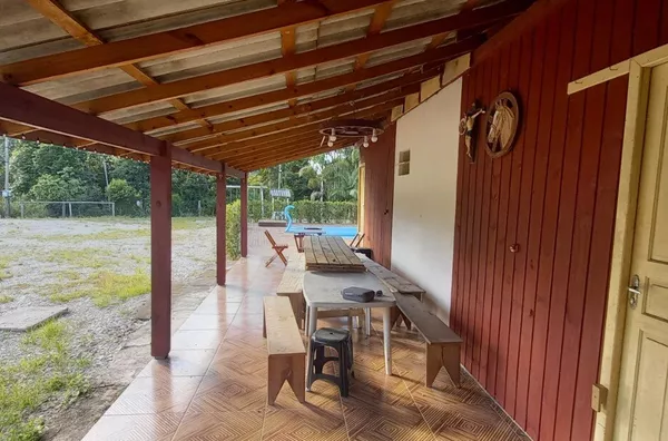 Casa de madeira com 100m², distribuído em 4 dormitórios, sala, cozinha um banheiro, área com churrasqueira, fogão a lenha, garagem coberta.