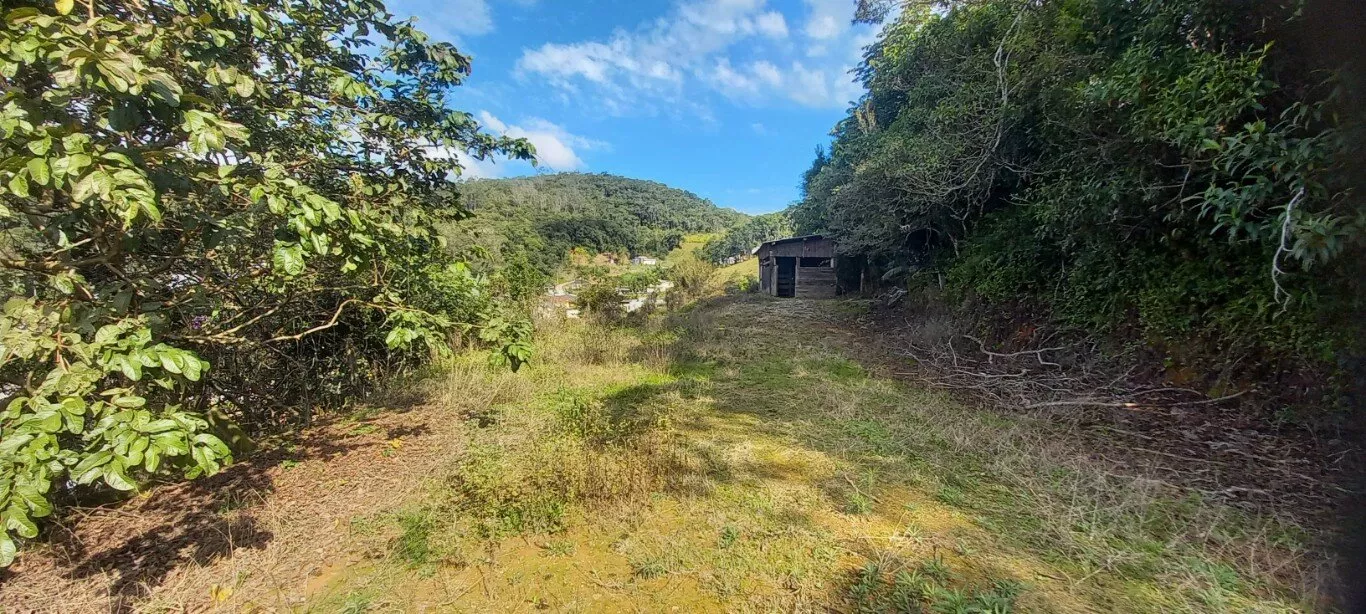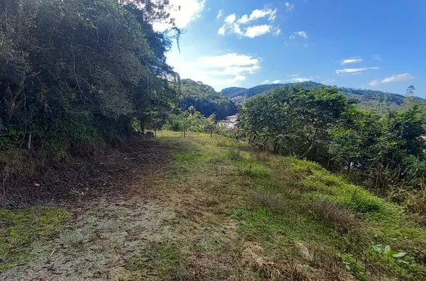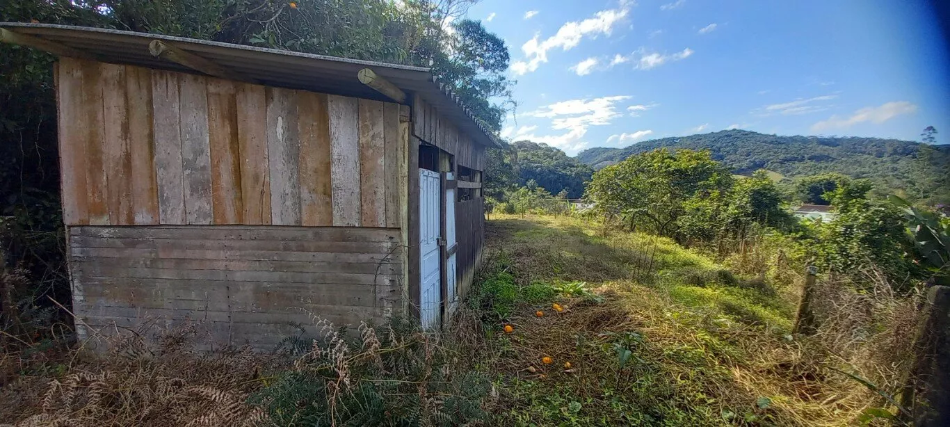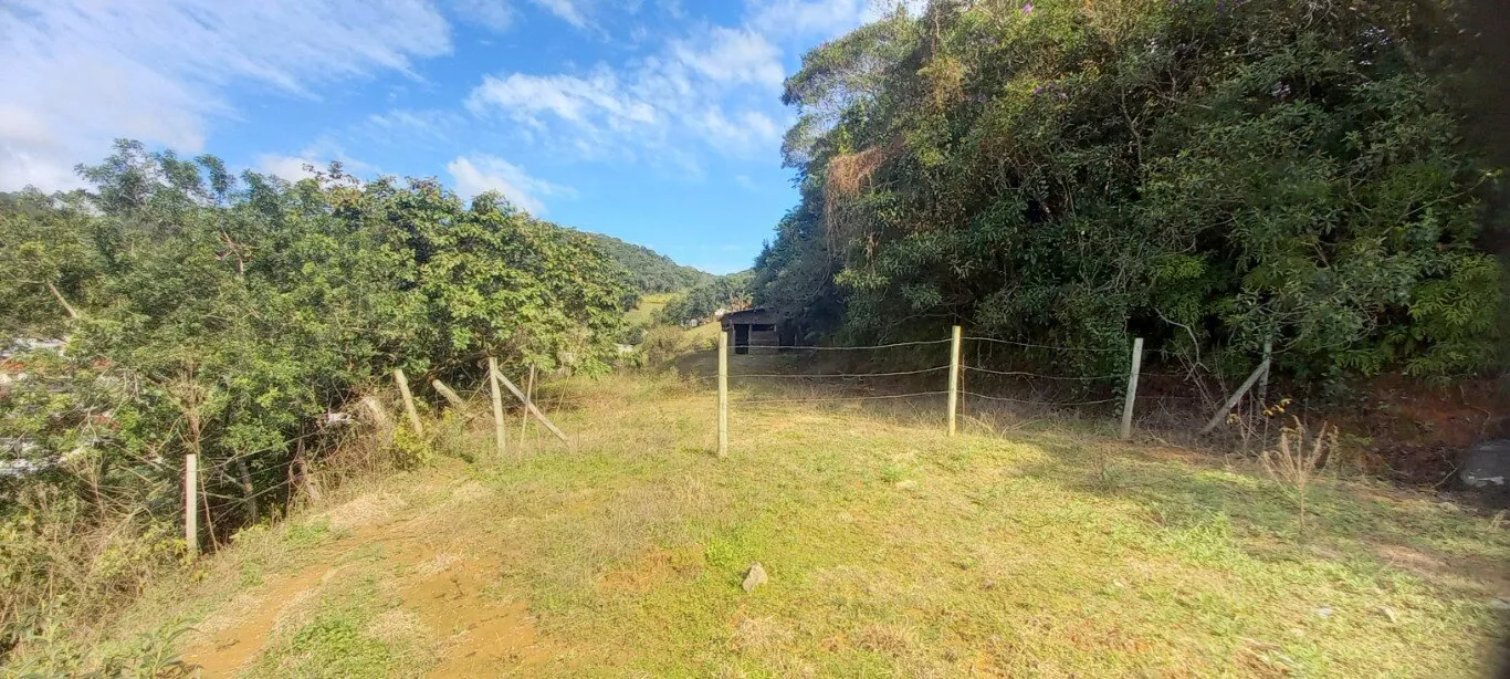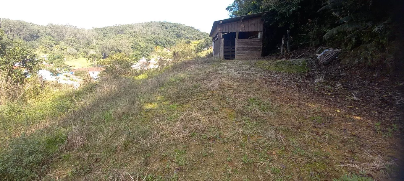 Terreno urbano com 2.300m², topografia em parte plana e acidentada, algumas árvores frutíferas e rancho de madeira.