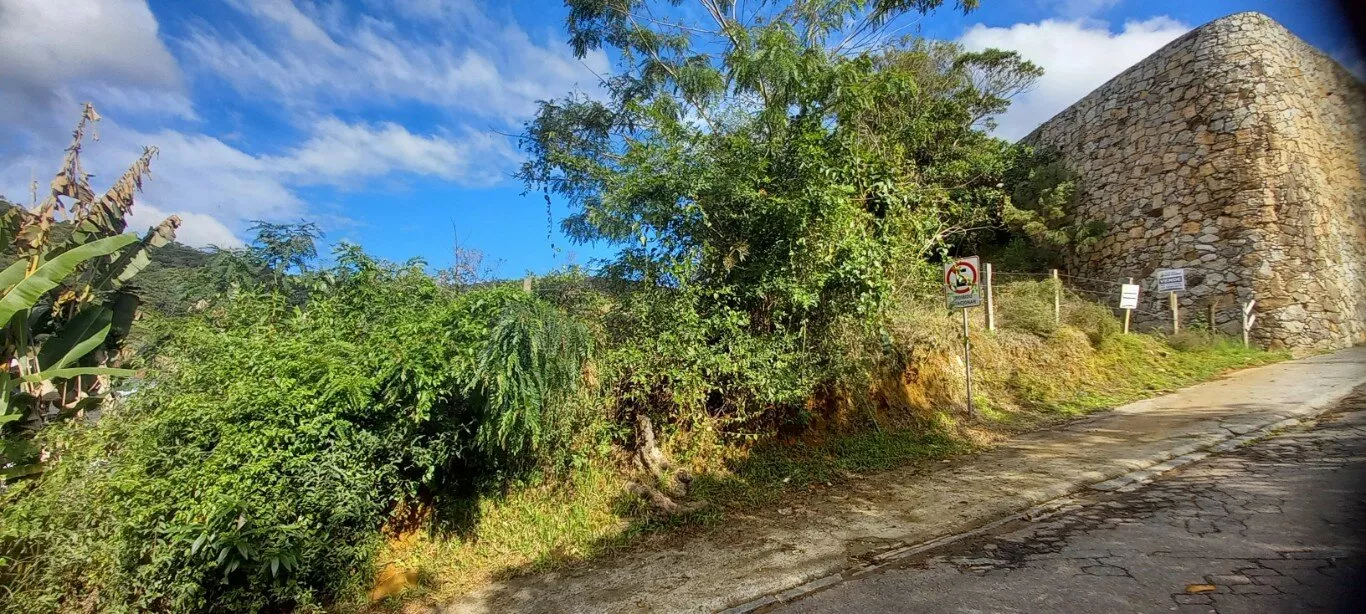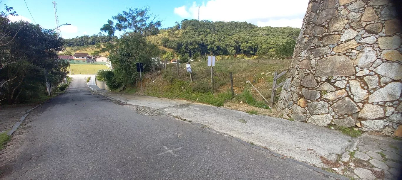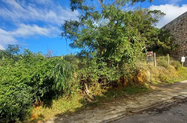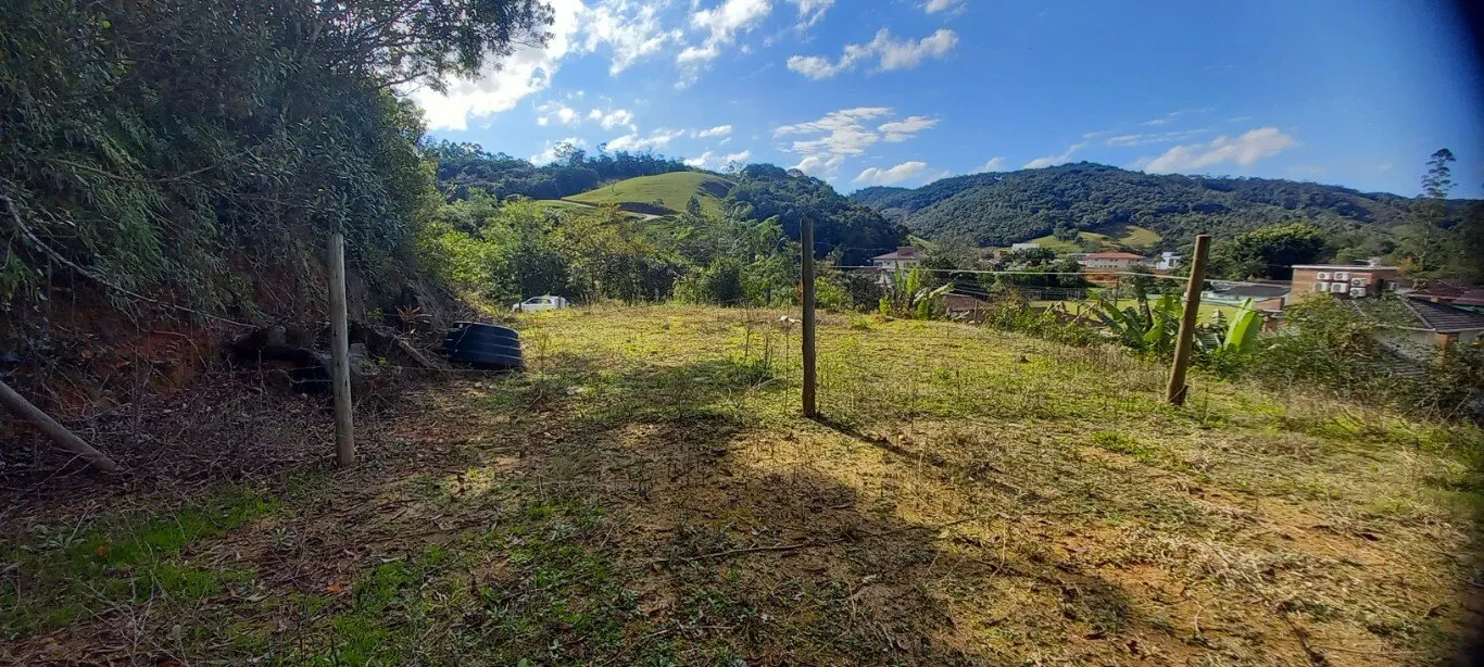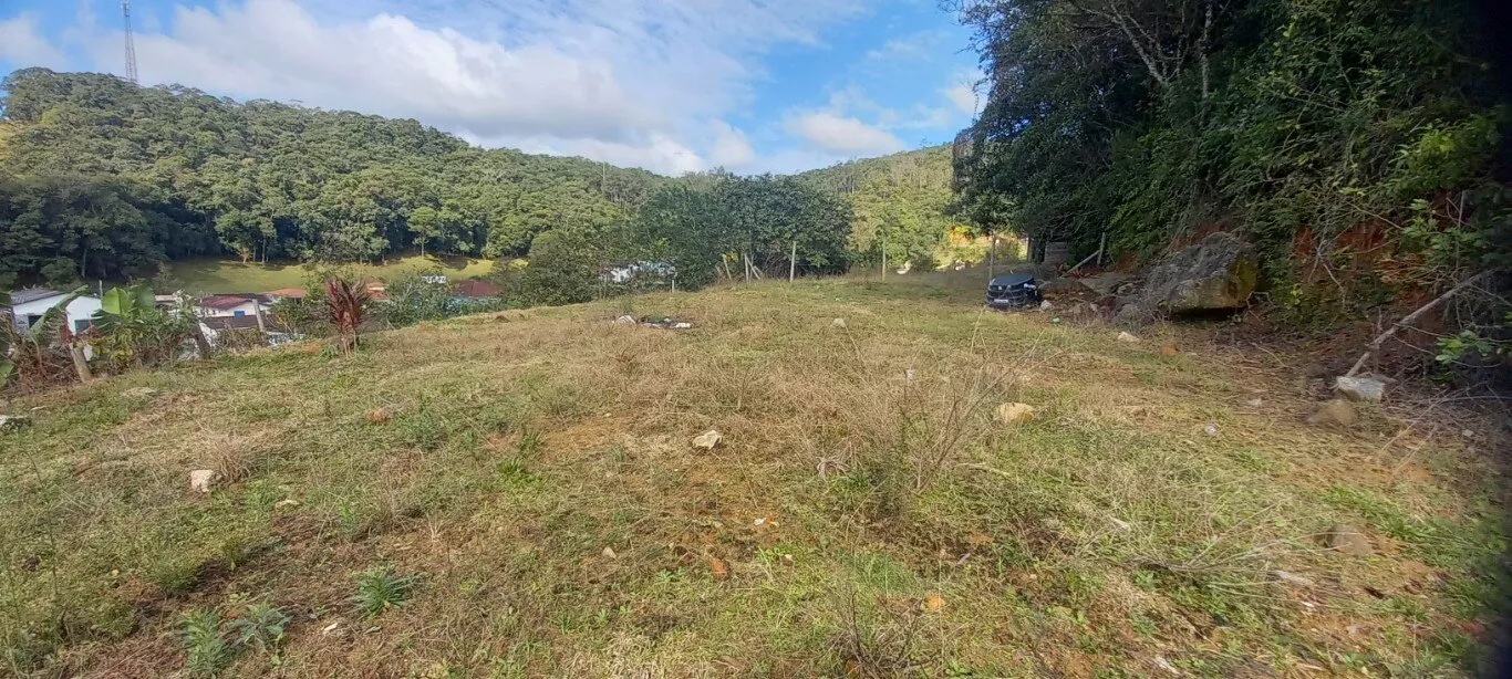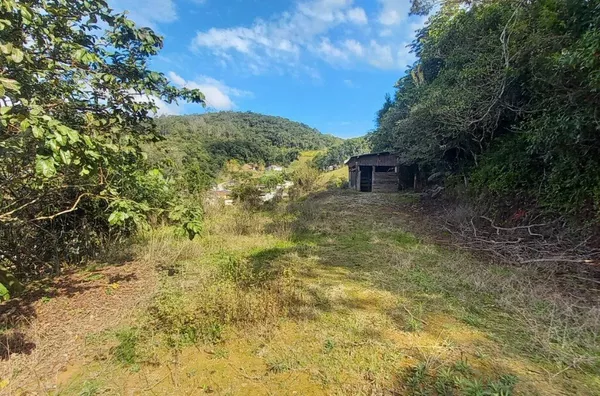 Terreno urbano com 2.300m², topografia em parte plana e acidentada, algumas árvores frutíferas e rancho de madeira.