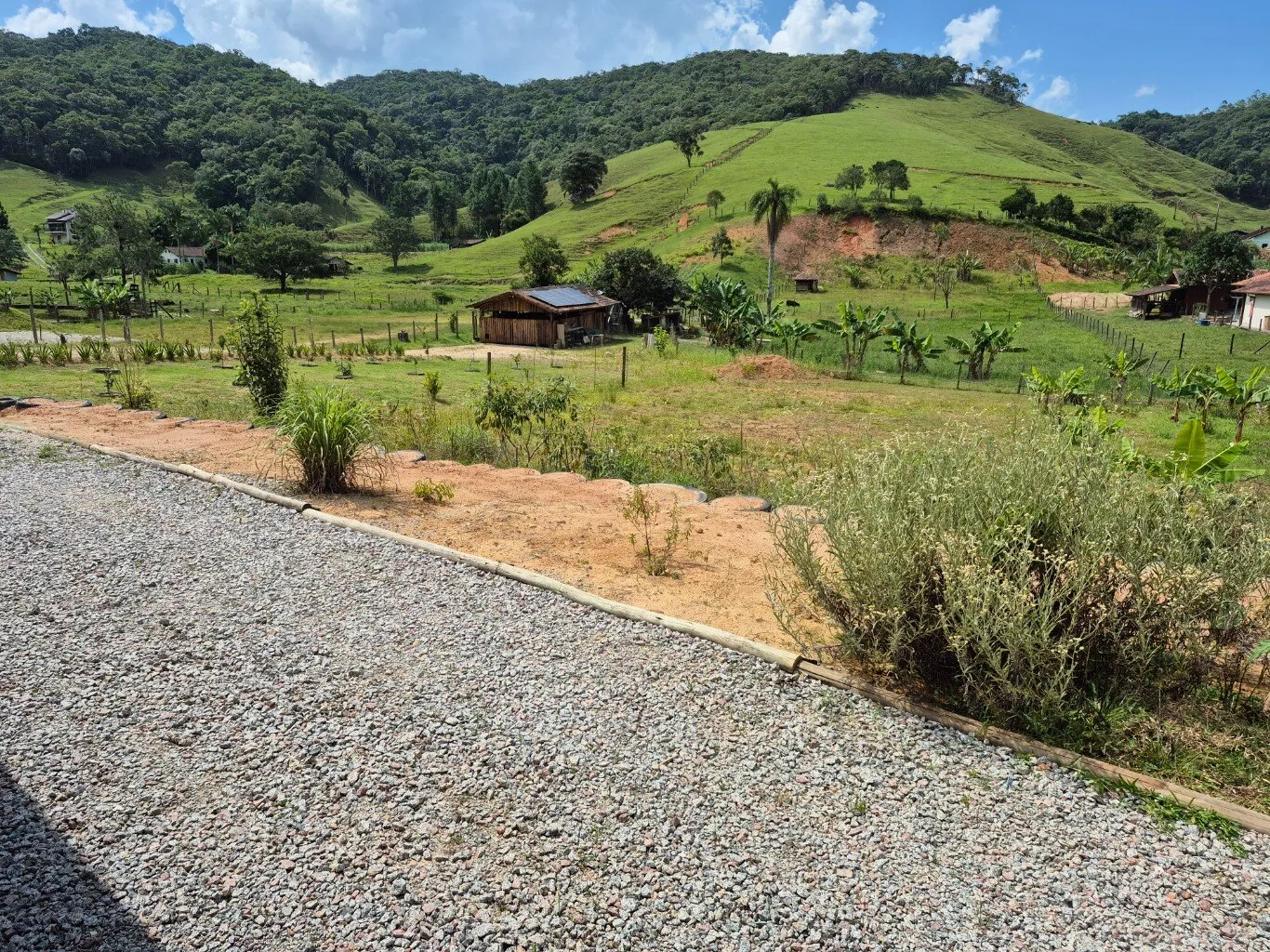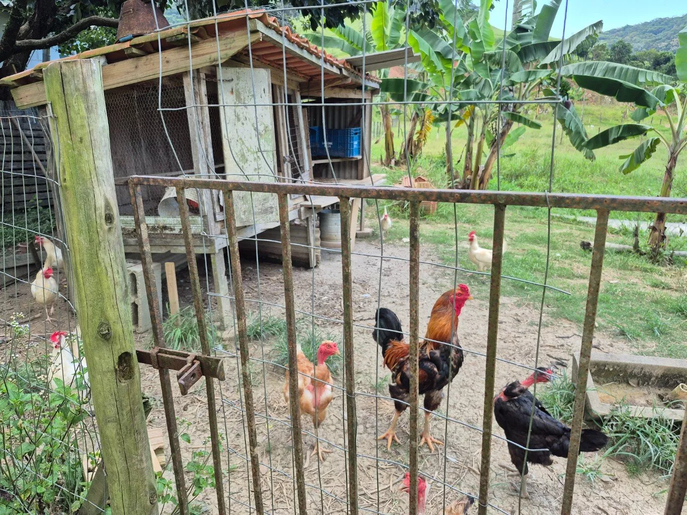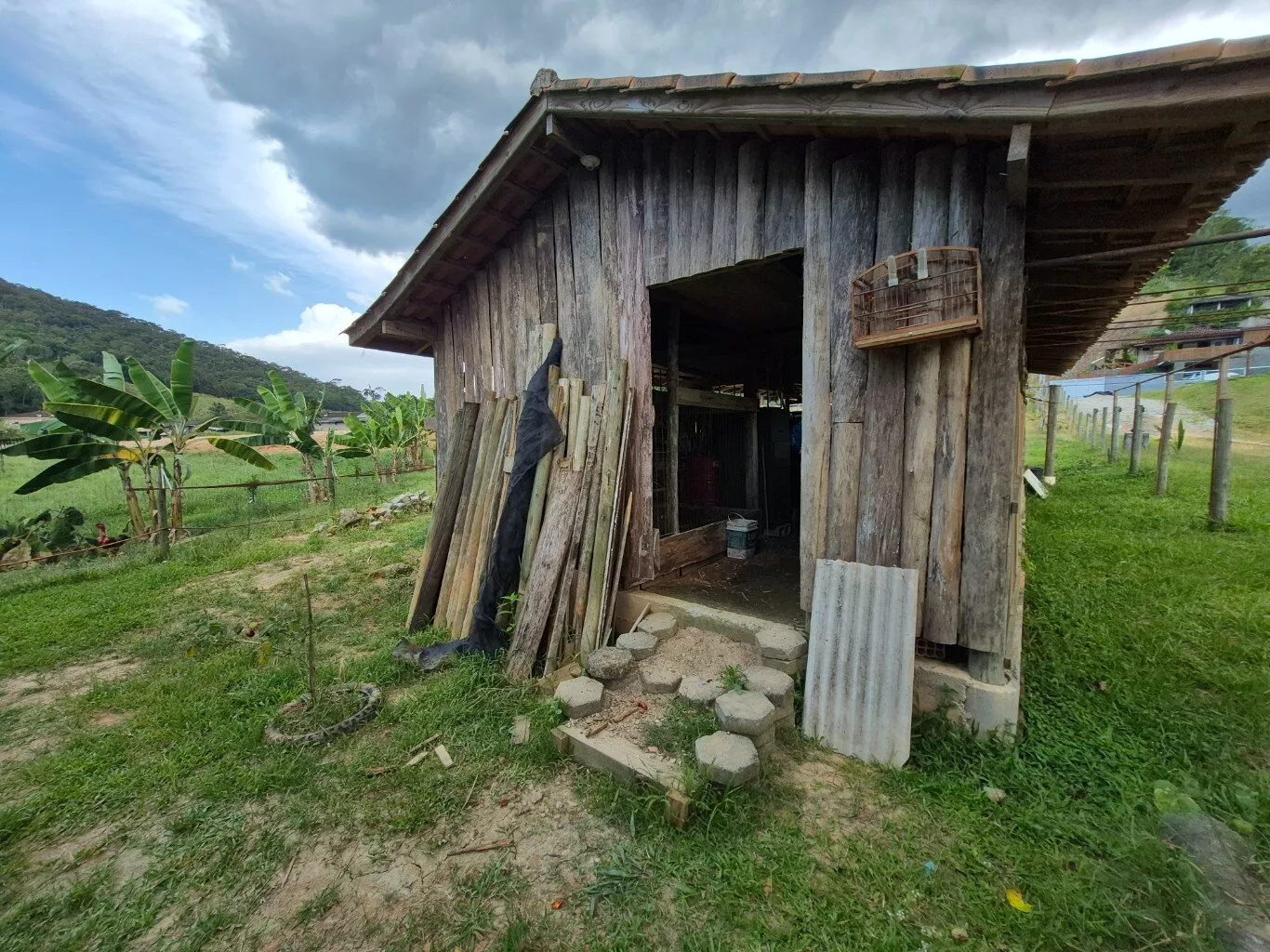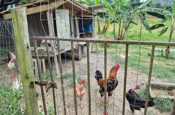 Área com 6.000m², todo cercado, topografia plana, córrego passando pela propriedade, frutas, espaço para animais, galinheiros, rancho de madeira para ferramentas