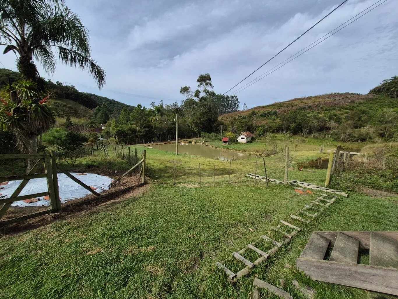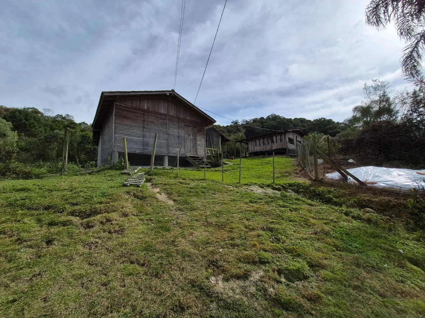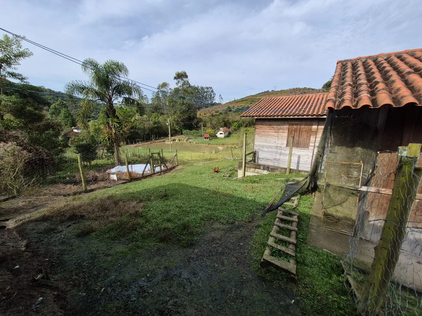 Rancho de madeira com aproximadamente 40m2 para guardar ferramentas. Uma cocheira e mais dois galinheiros.