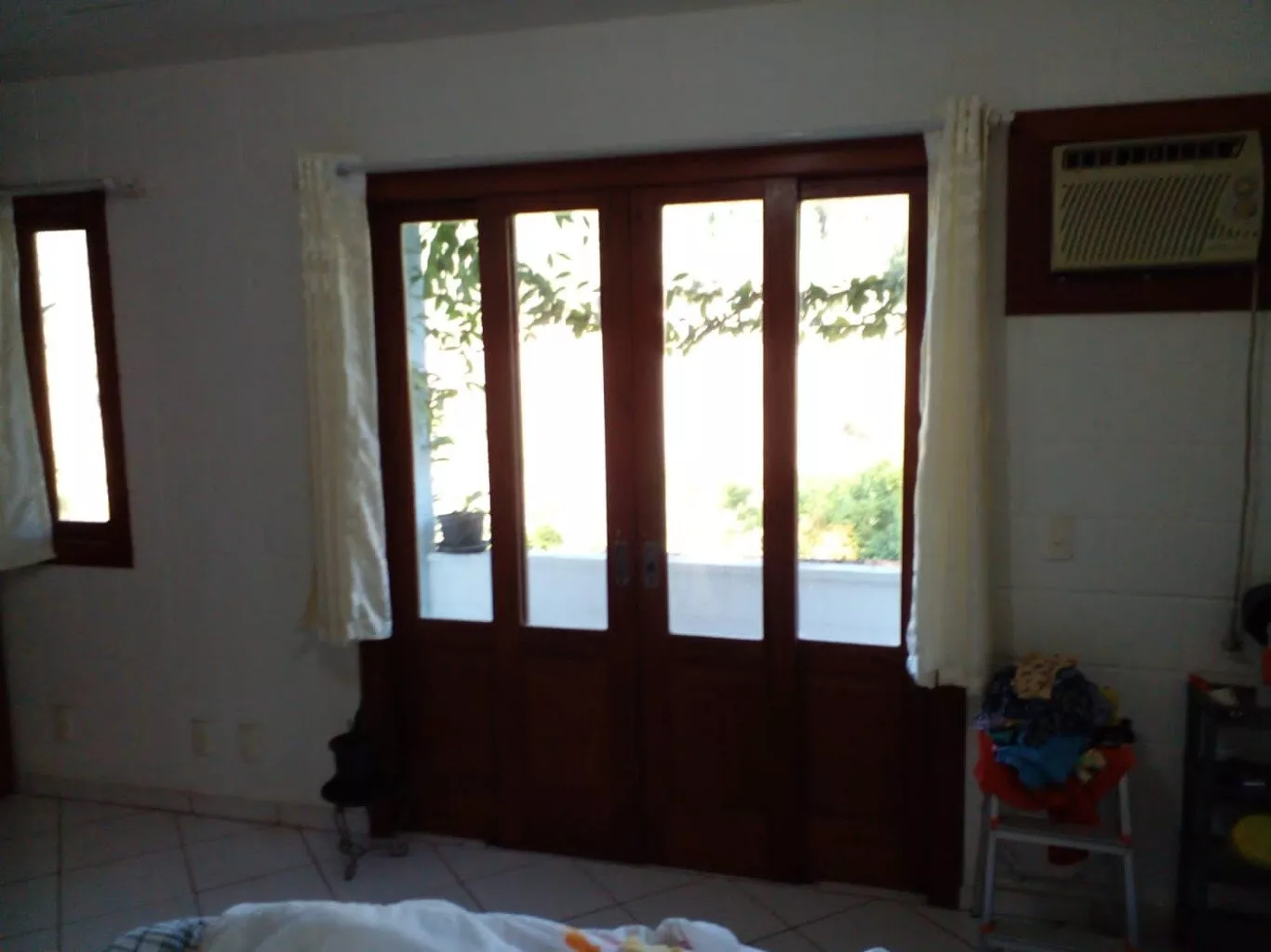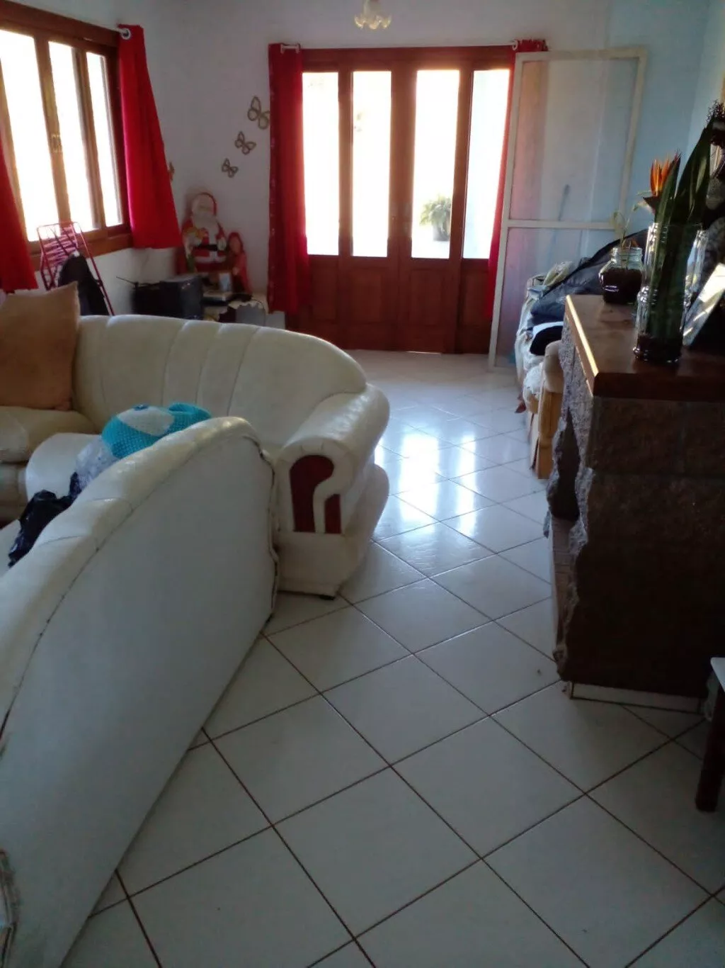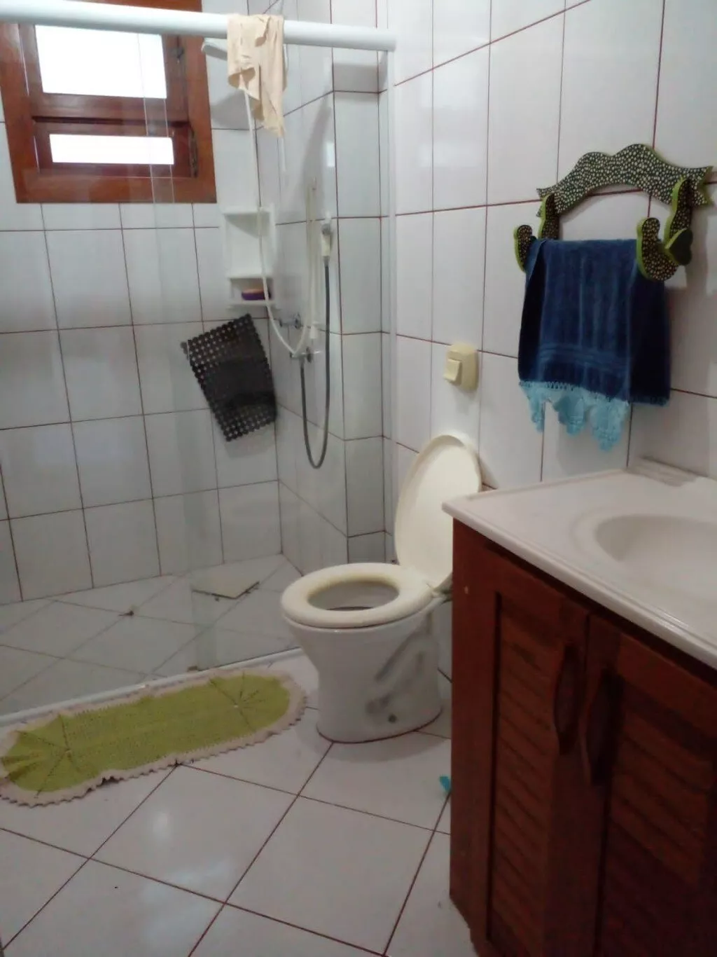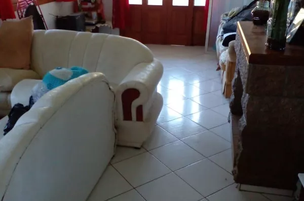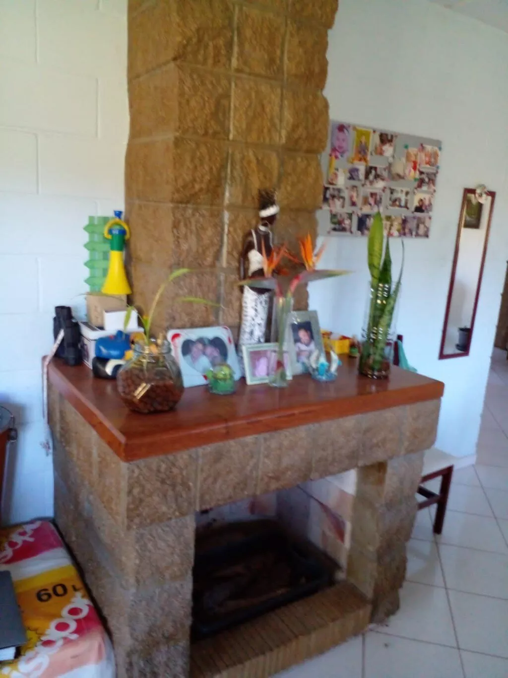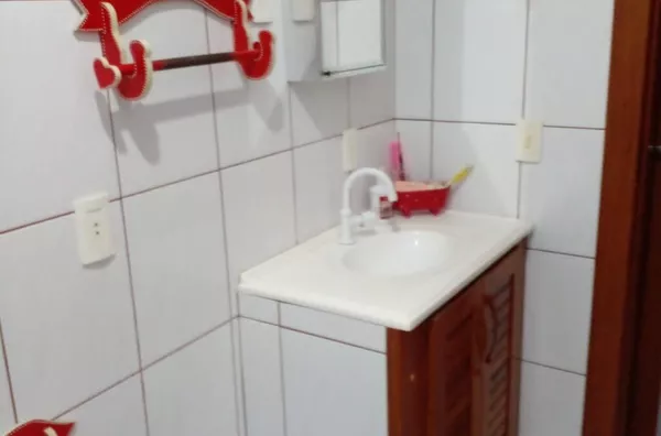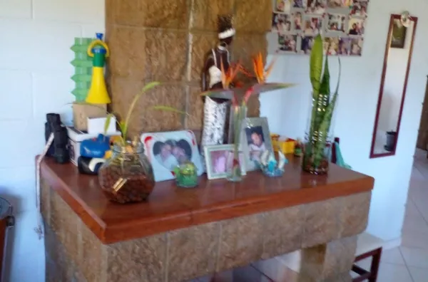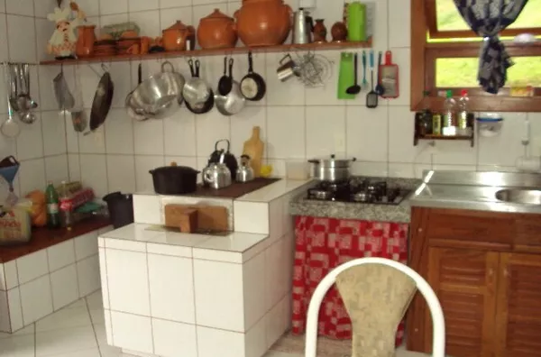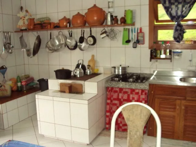 TÉRREO: Cozinha 5.00x4.00m.Com fogão à lenha e balcão em L feito de blocos com aberturas em angelim. Sala ampla com 14.00x4.00m, lavabo, churrasqueira, 01 Banheiro social com 3.00x1.50 com box e balcão de pia em blocos e portas em angelim. 01 Quarto com 3.00x3.00m com armário feito de blocos e abertura em angelim.