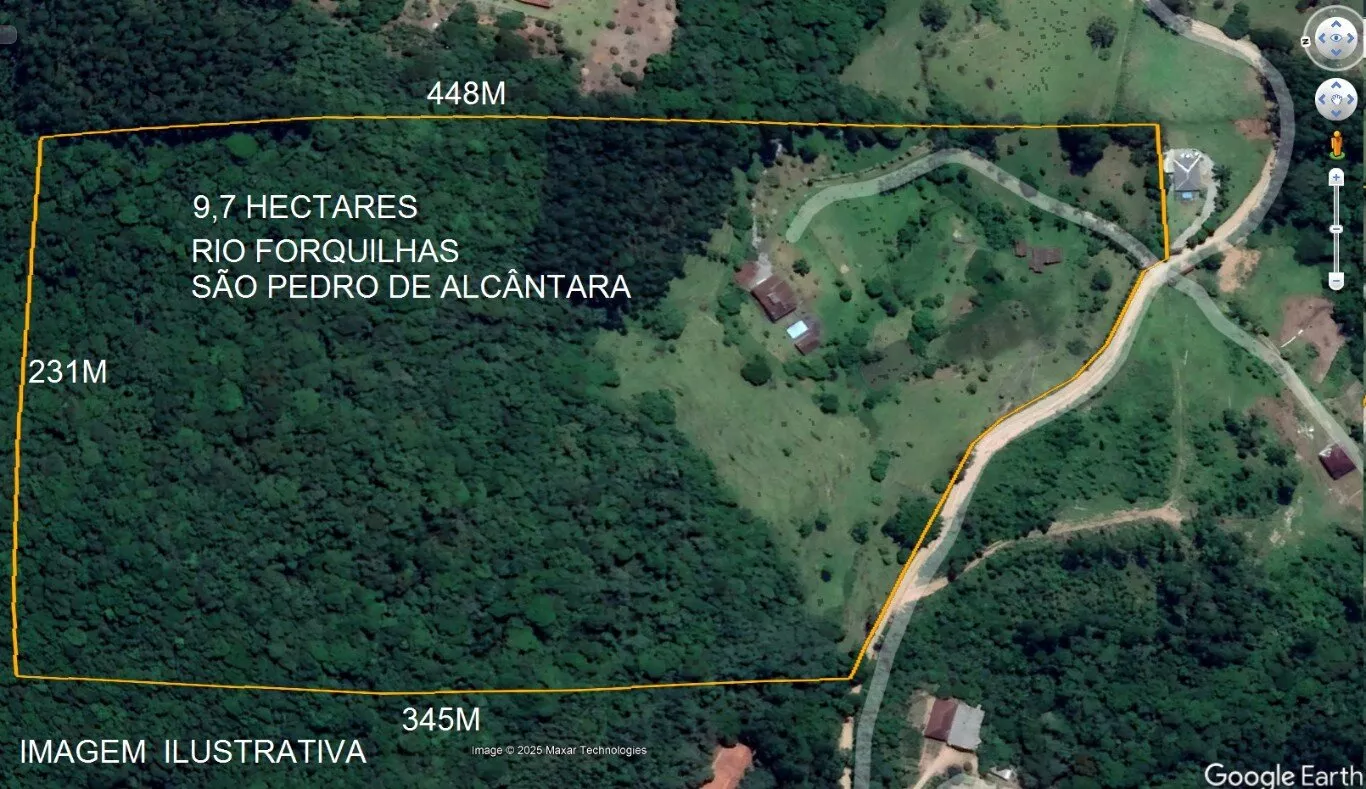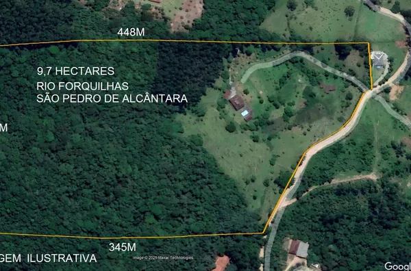 Terreno rural situado em Rio Forquilhas, São Pedro de Alcântara, com 97.000,00m², com topografia ondulada e acidentada, possui aproximadamente 32.000m² em área de pastagem, inúmeras frutíferas, e uso de benfeitorias, 4.000m² em reflorestamento de eucaliptos, 61.000m² de mata nativa, várias nascentes na propriedade, córrego, 02 açudes desativados, lago ornamental com peixes, galinheiro e área cercada com tela de aproximadamente 1.500m², casarão antigo de madeira de Canela, rancho.