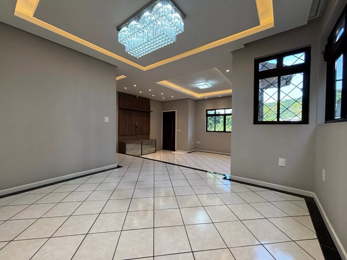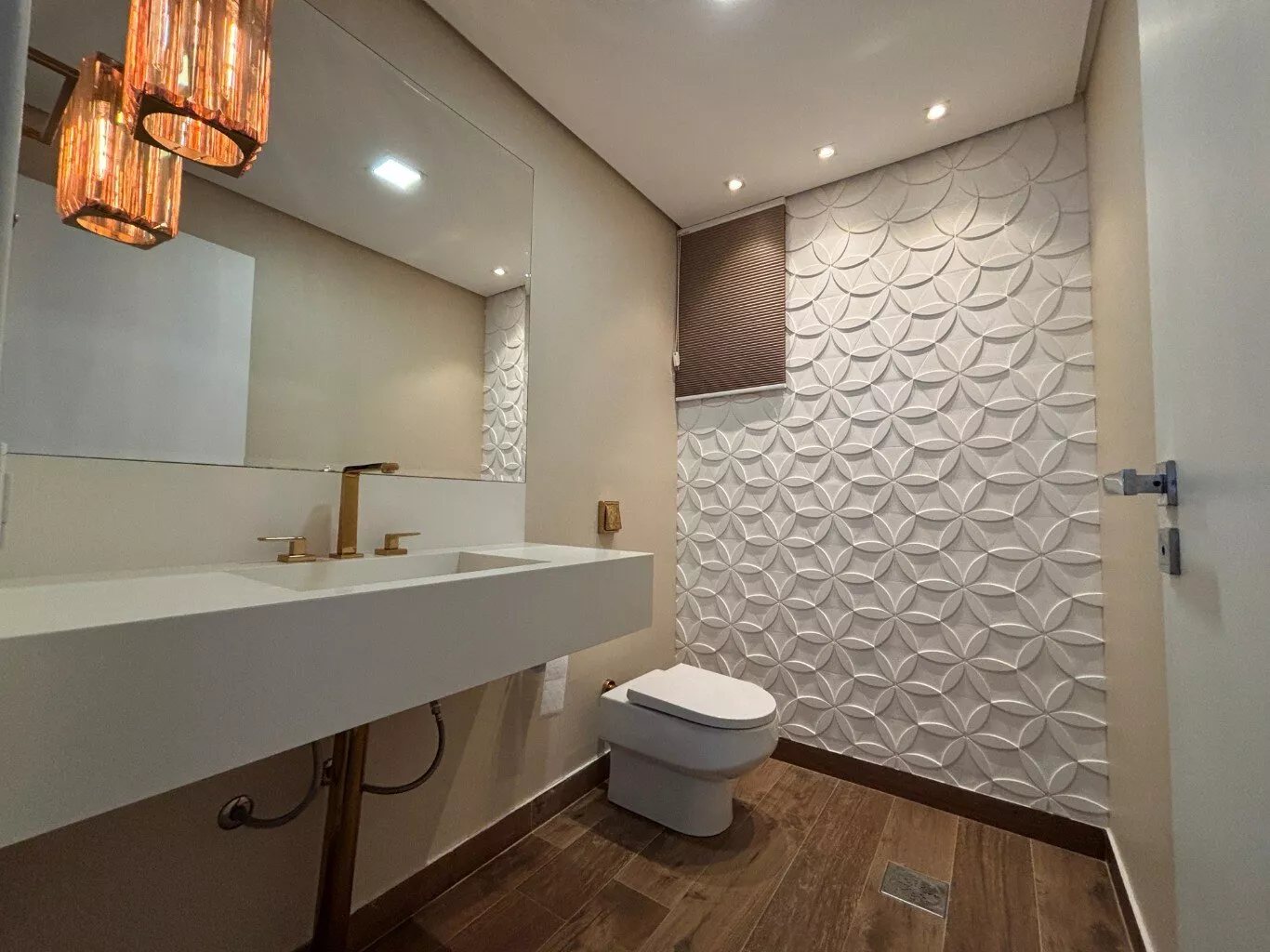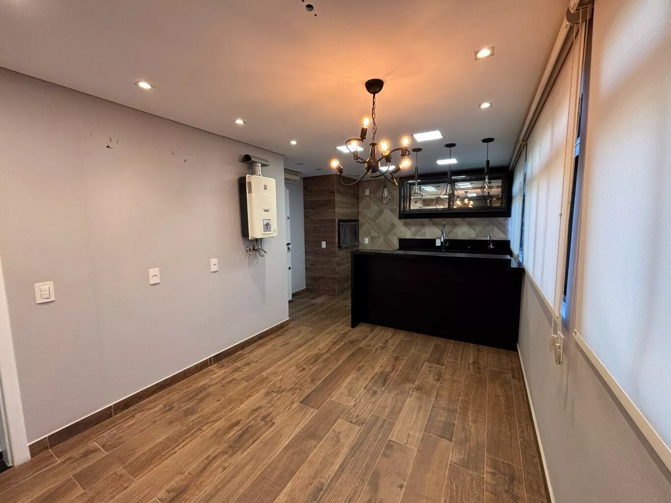 1º Piso: Ampla sala e área gourmet com acabamento em gesso e iluminação, churrasqueira, 01 cozinha com mobilia e 01 lavabo.