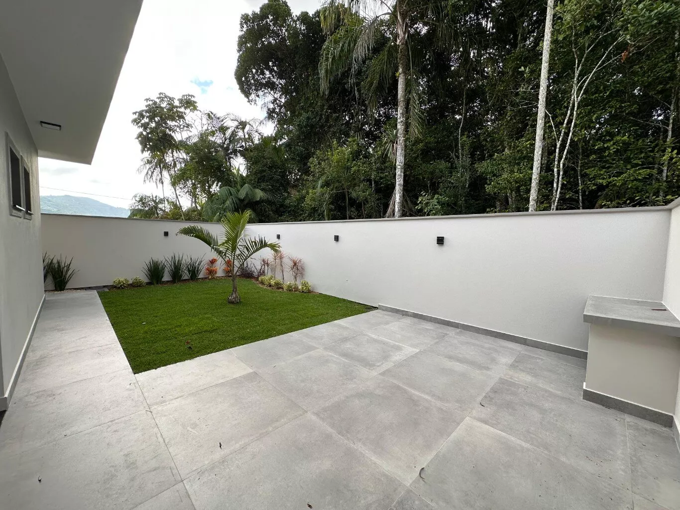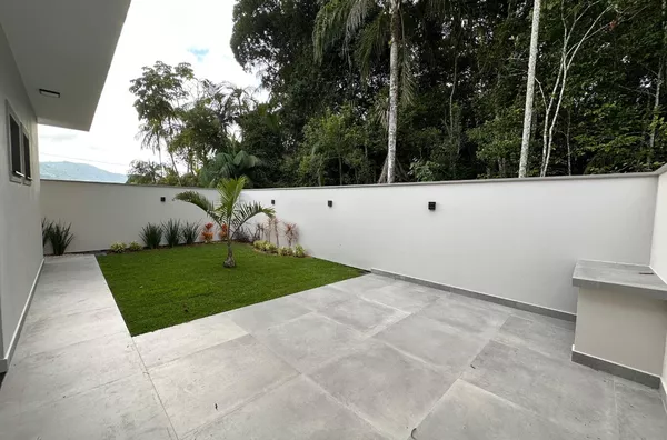 Pátio frontal com jardim e passagem lateral, proporcionando melhor circulação e ventilação;