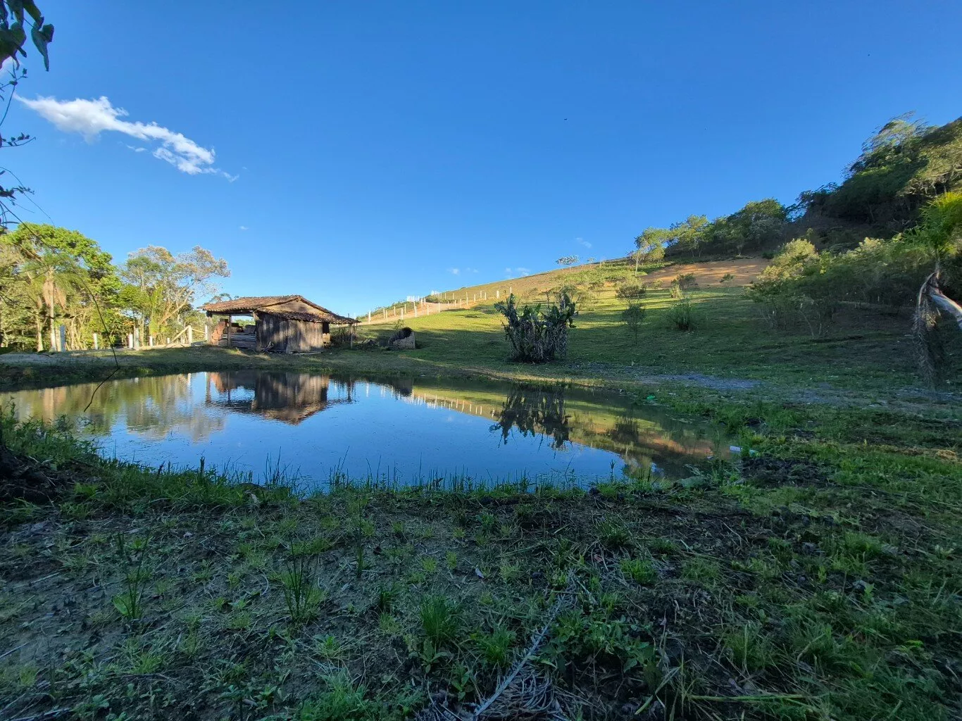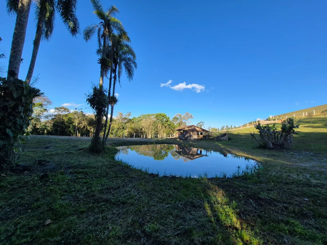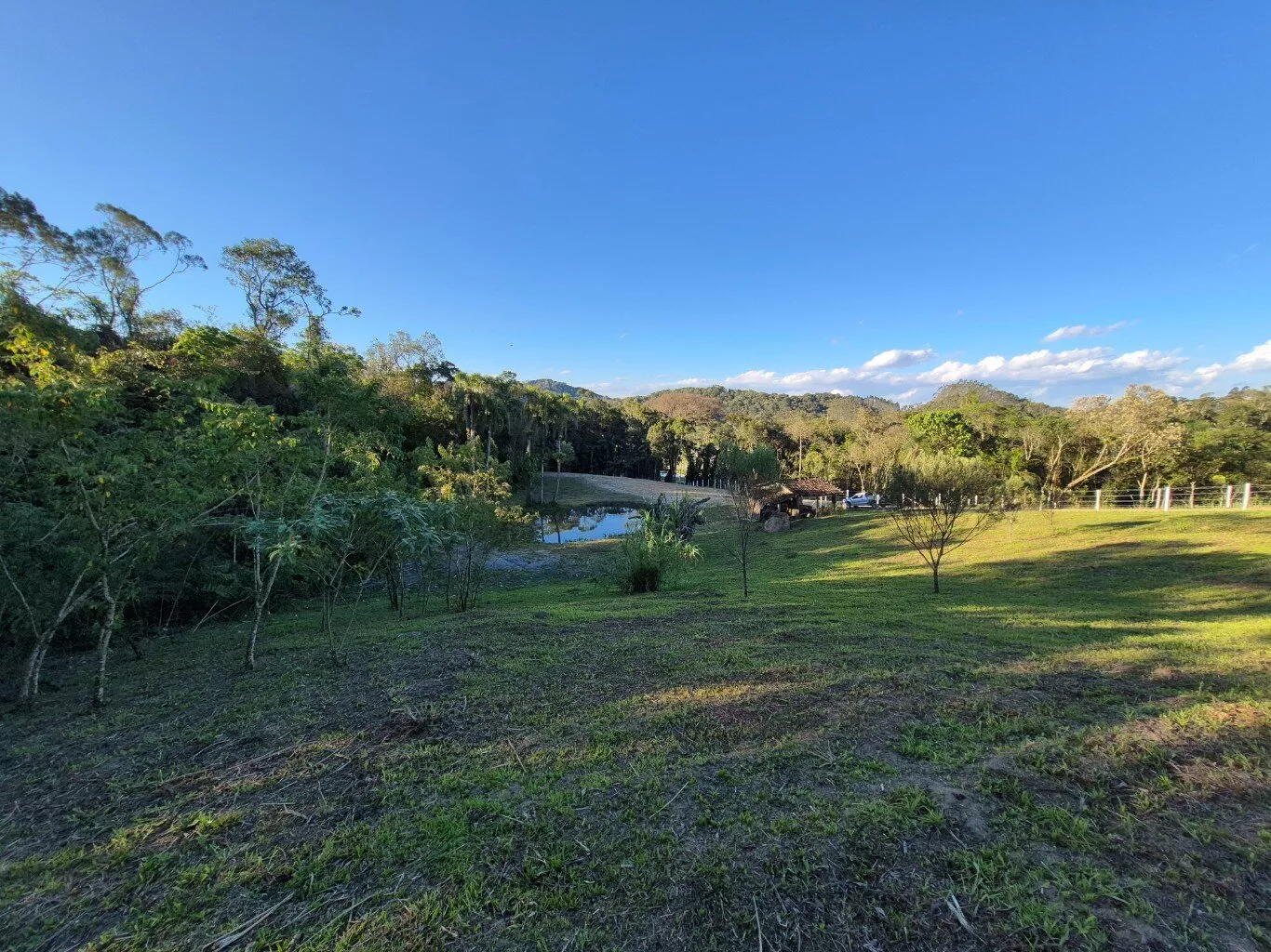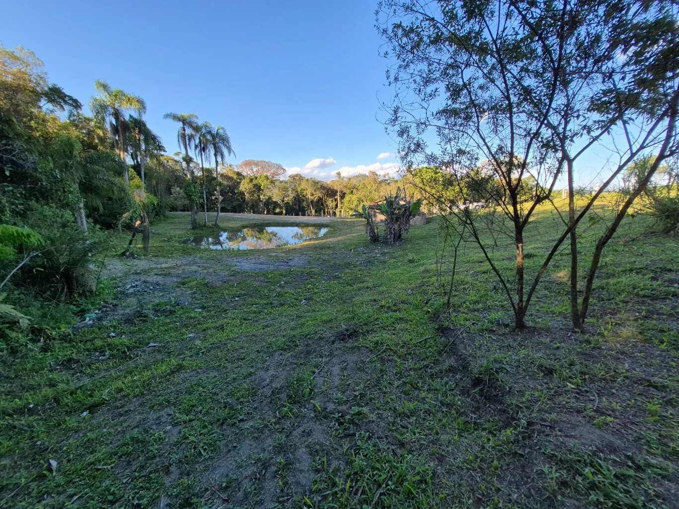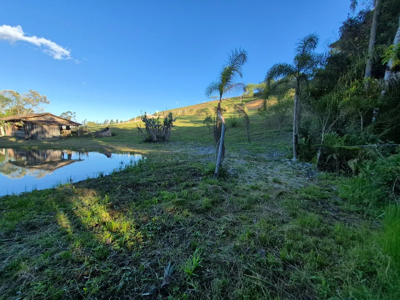 Topografia levemente inclinada, com ótimo espaço para plantio de frutíferas e horta, possui um pequeno rancho de madeira e lago artificial.