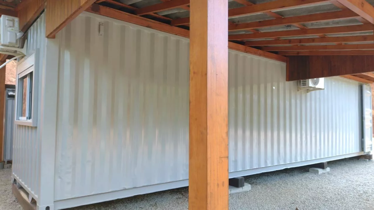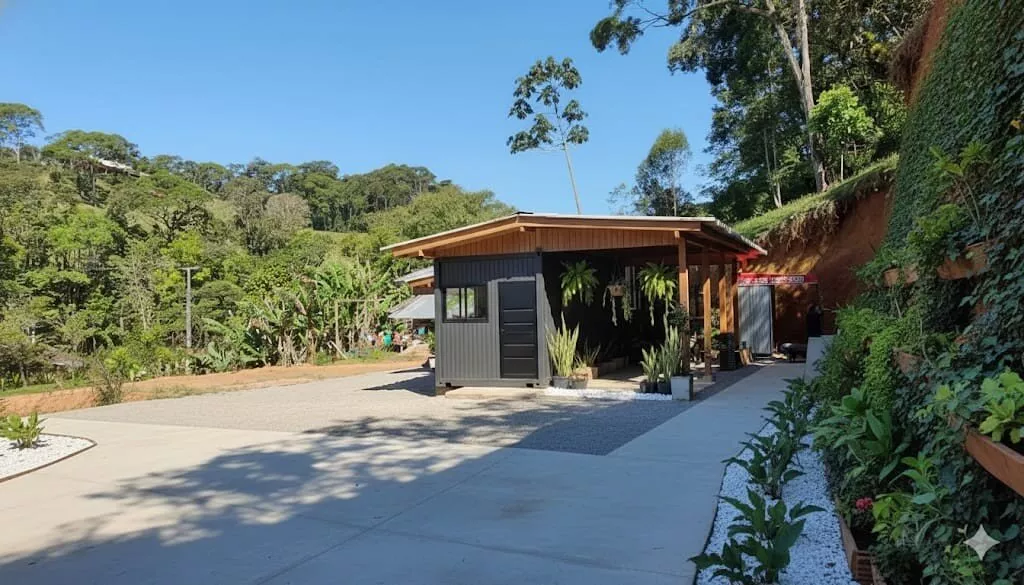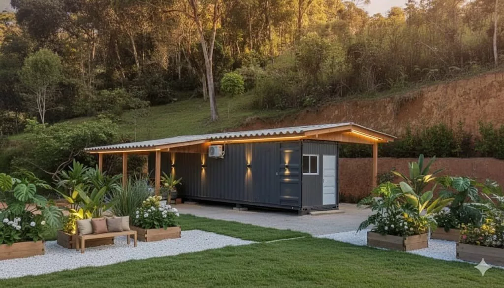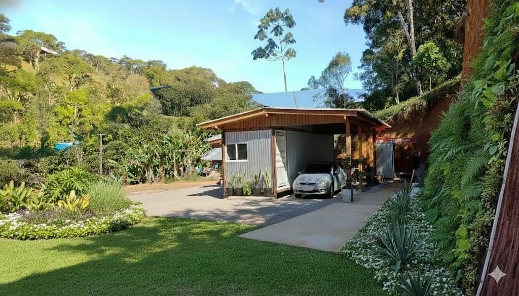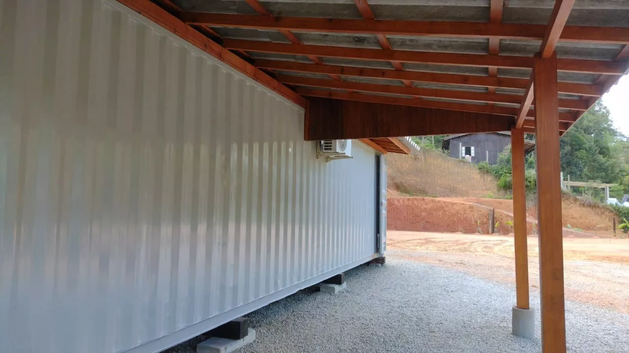 Possui um casa container com 88,22m², mista de madeira e alvenaria, com 02 dormitórios, sendo 01 suíte, sala e cozinha, lavanderia, 01 vaga de garagem coberta, 01 banheiro social, climatizada com ar condicionado na sala e no quarto, projeto em fase de finalização, 200m² que pode ser utilizado como jardim ou estacionamento.