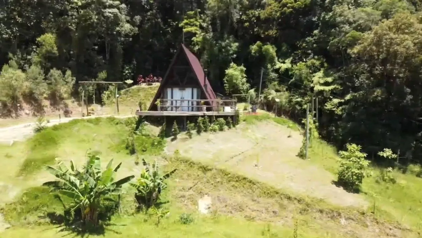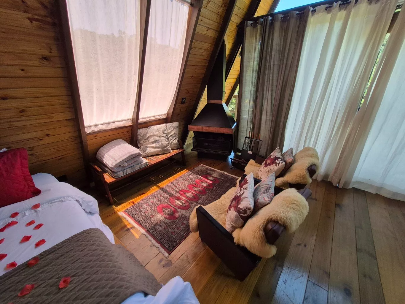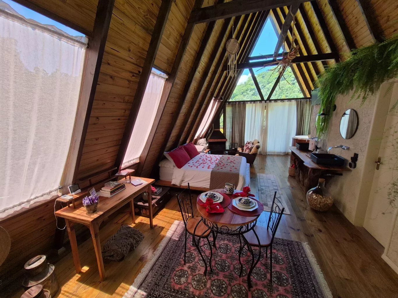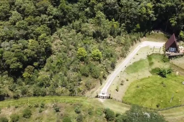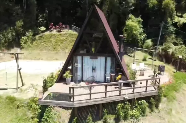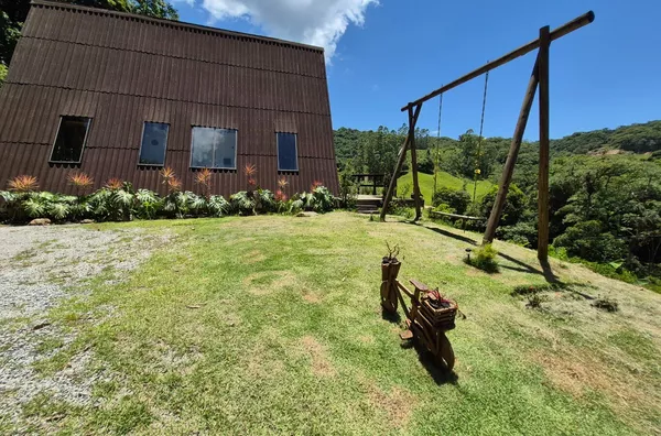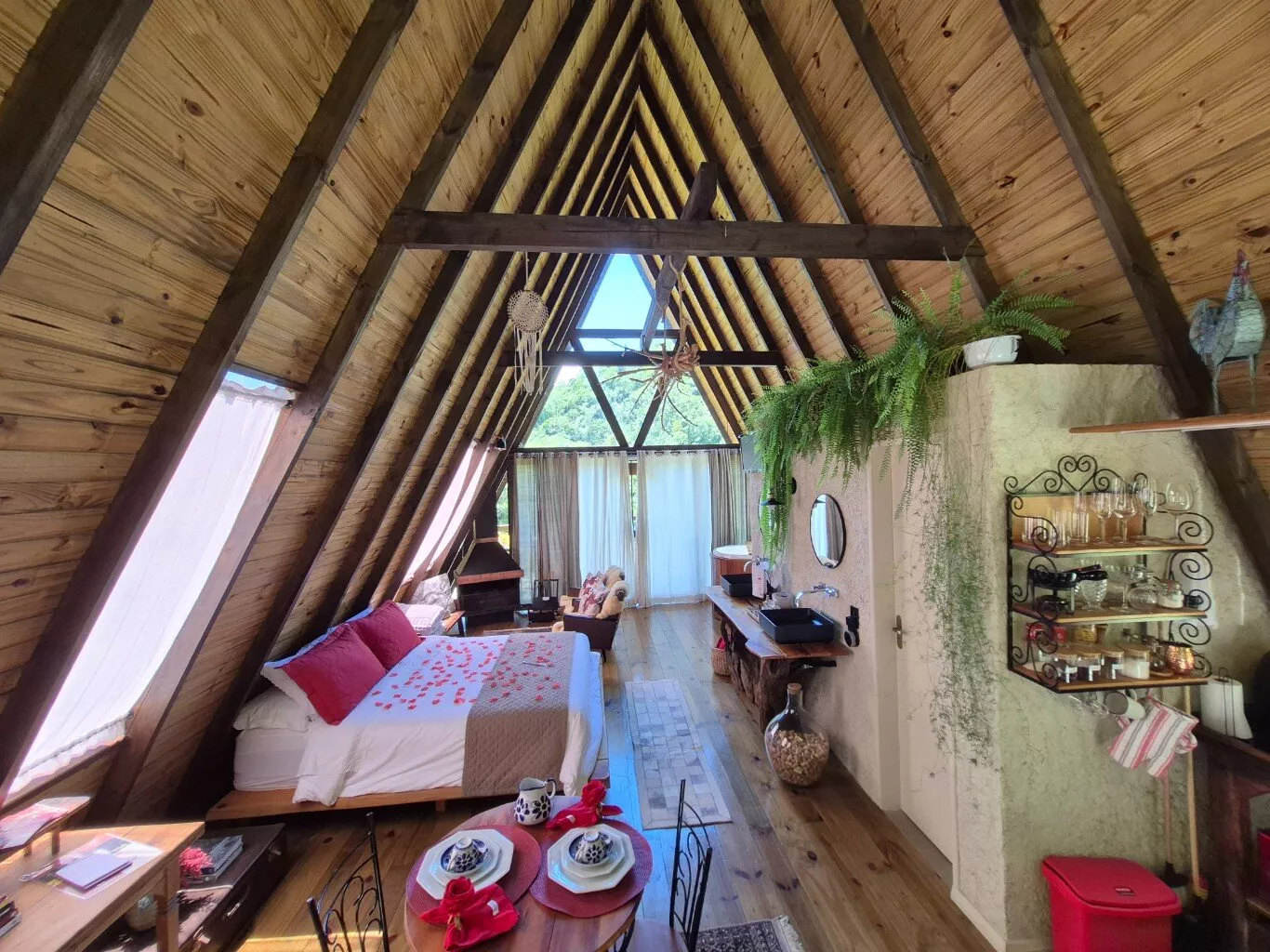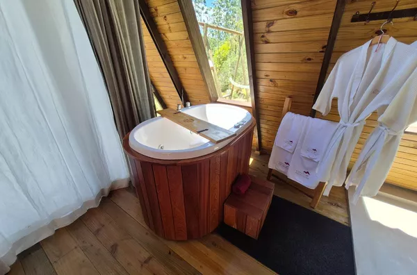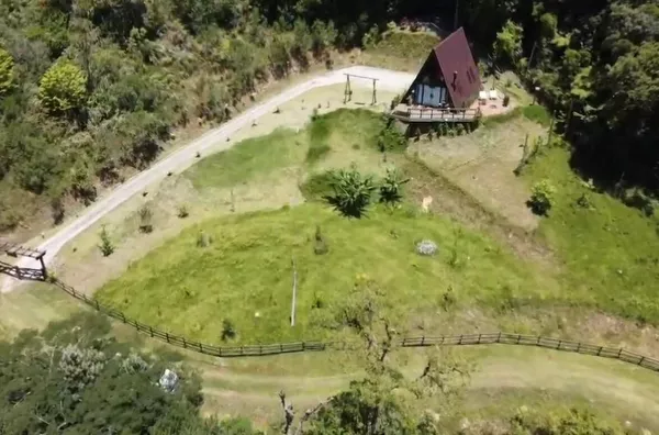 Maravilhoso chalé, totalmente mobiliado, ambiente interno em conceito aberto, cama de casal, cozinha, sala, banheira, bwc, ar condicionado, água aquecida, deck/sacada com vista para mata nativa, lareira de chão externa com ambiente, balanço, banheira externa, gramado no entorno do chalé com aproximadamente 3.000m².