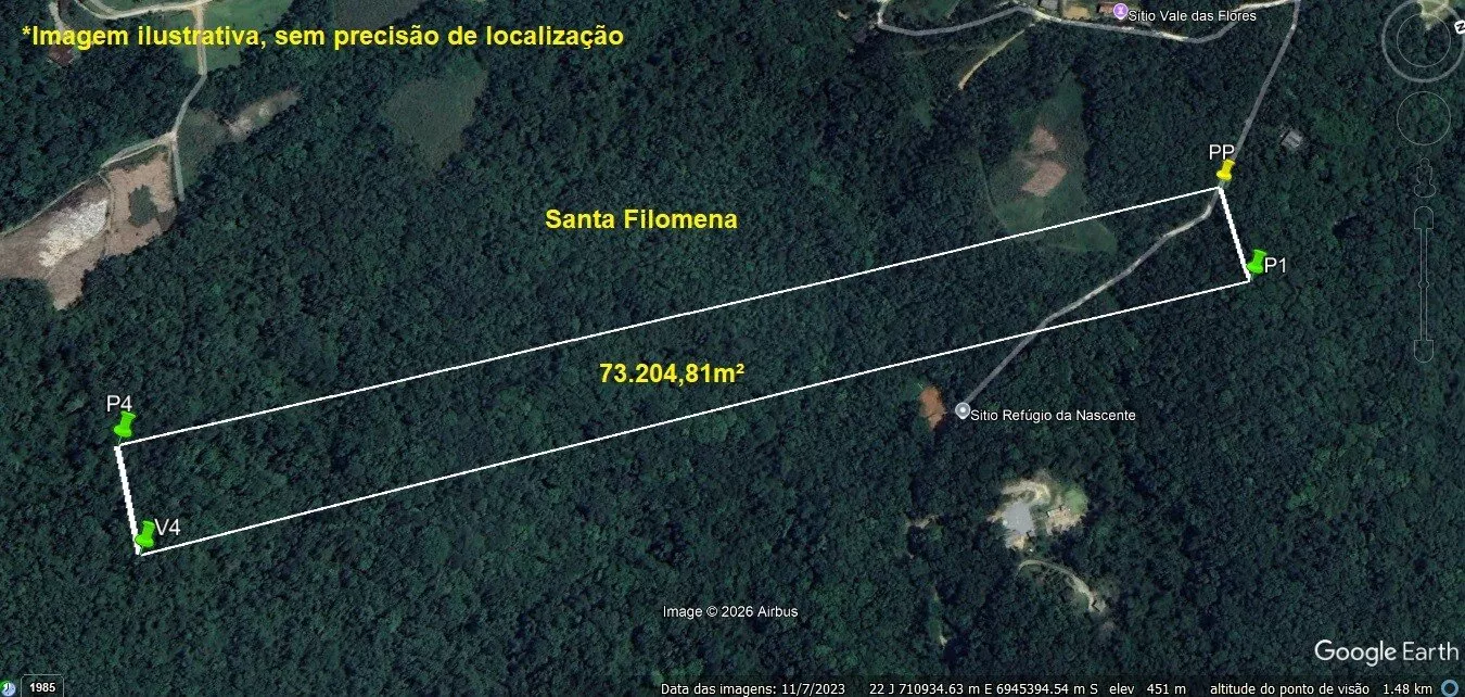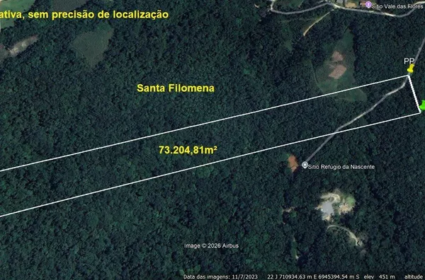Excelente terreno rural, com 73.204m², situado na localidade de Santa Filomena, São Pedro de Alcântara/SC. Topografia ondulada e acidentada, possui nascente d'agua, córrego, área para plantação e mata nativa preservada.